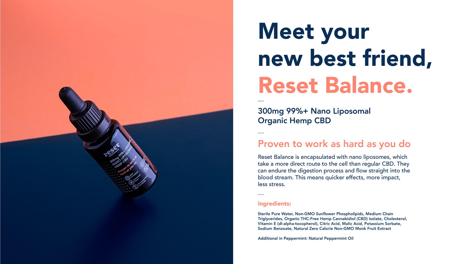 To finalise the project as a complete package, I was in charge of directing the look and feel of the e-commerce website which also serves as point of education and a resource for the research Reset are currently undergoing with their nano-delivered CBD. A plethora of icons, animations, images and research based copy was developed to round off an online source of rich information that persuades several consumers everyday to make the switch to nanoliposomal CBD.