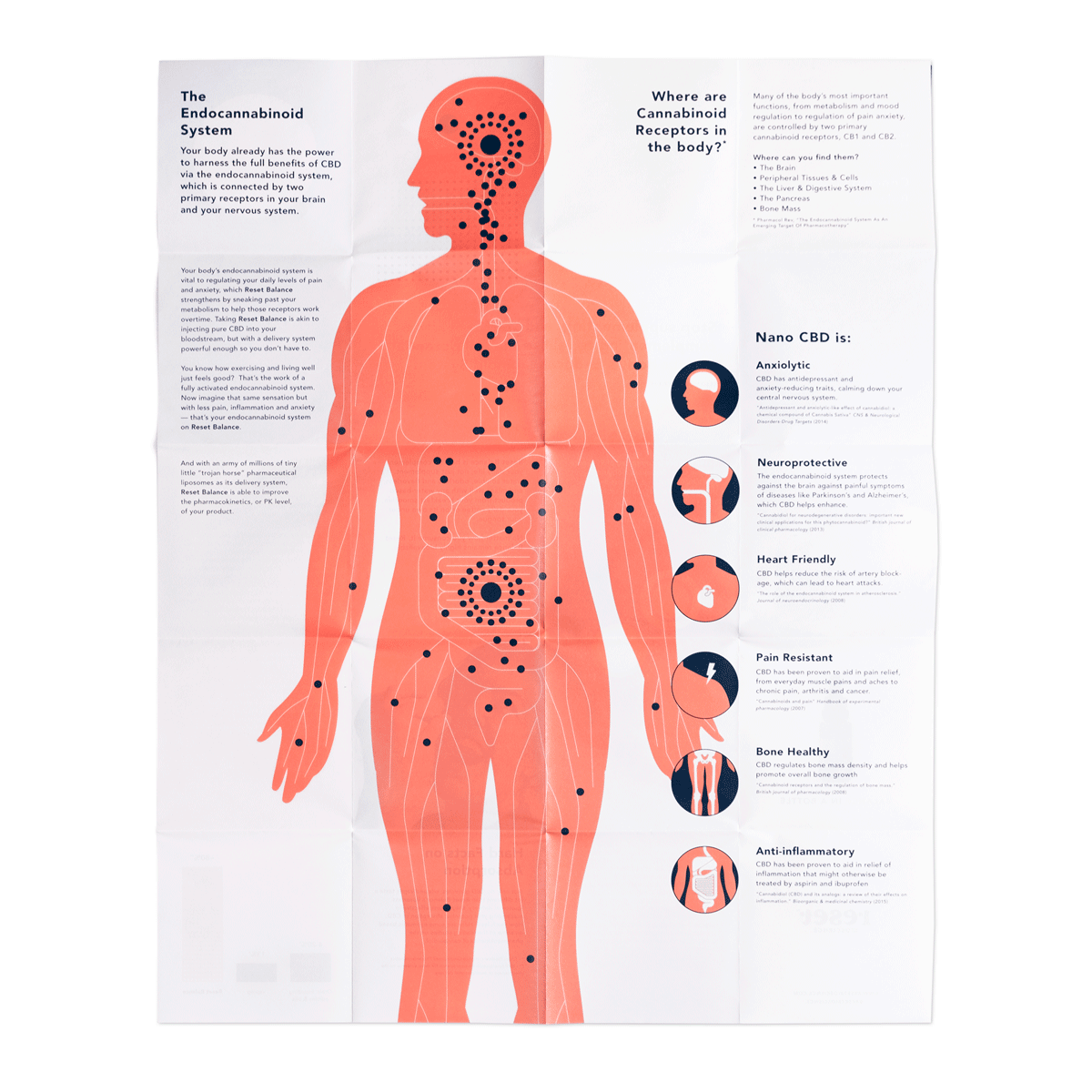Each purchase of Reset Balance comes with leaflet that explains the functions of the human endocannabinoid system. After much research and working back and forth with CBD specialists and copyrighters, a neat and concise educational piece of literature took the form of a folded leaflet that can be found in every box of Reset Balance.
