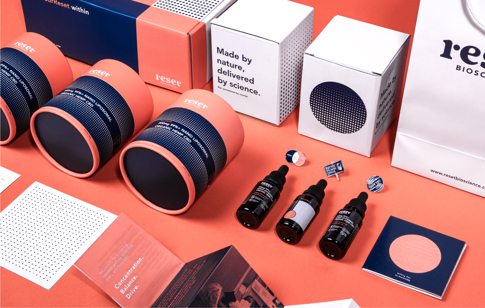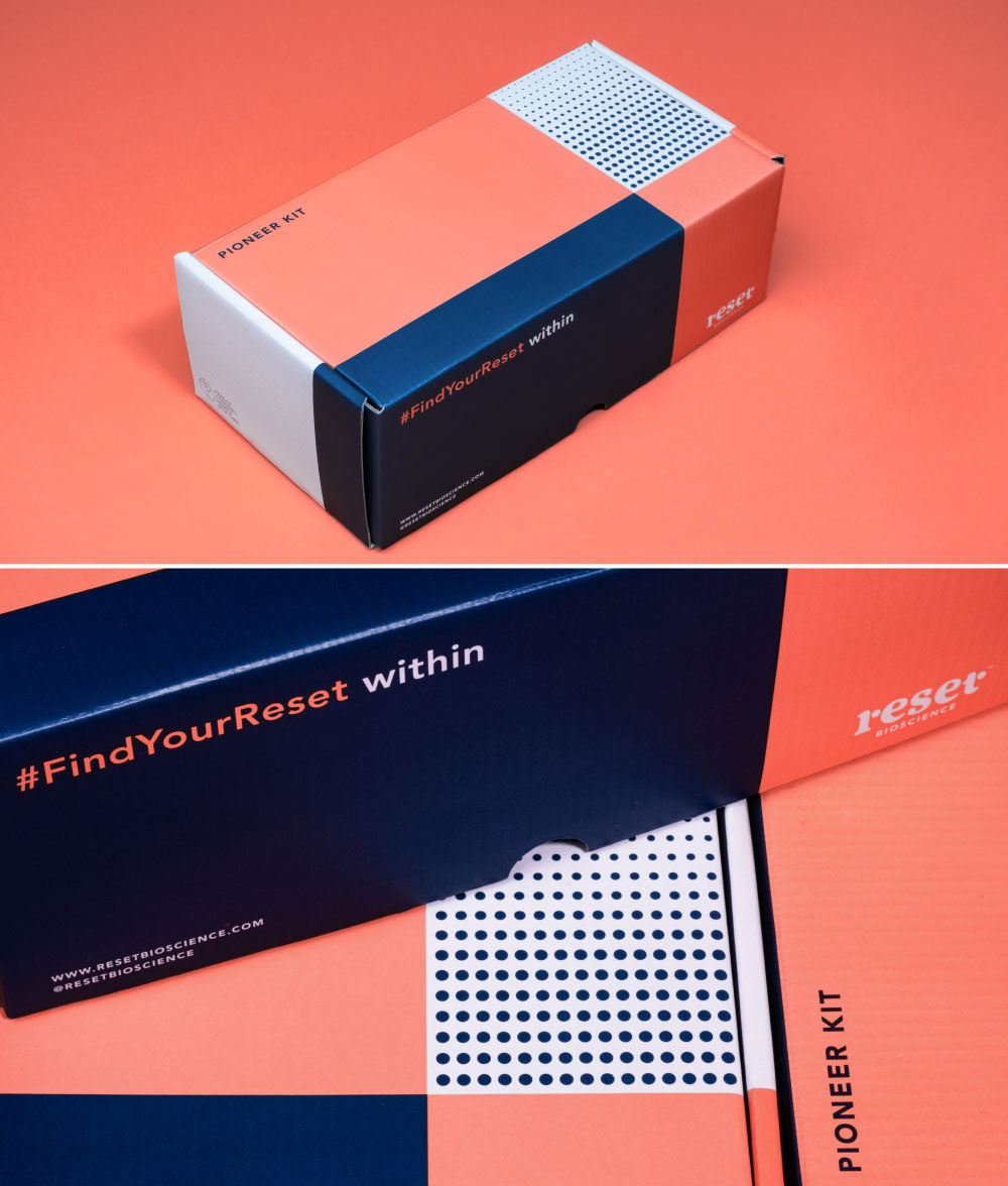 With regards to colour, it was important to keep the brand serious at times as CBD, at this very moment, is mostly used to self-medicate for afflictions such as PTSD, anxiety, period pain etc. It was important to be able to use paired down combinations of colour to allow the science to speak, while the introduction of pattern work and more colour helped with creating marketing and promotional materials. We settled on Pantone 170c and 540c ("Reset salmon" and "Reset blue").