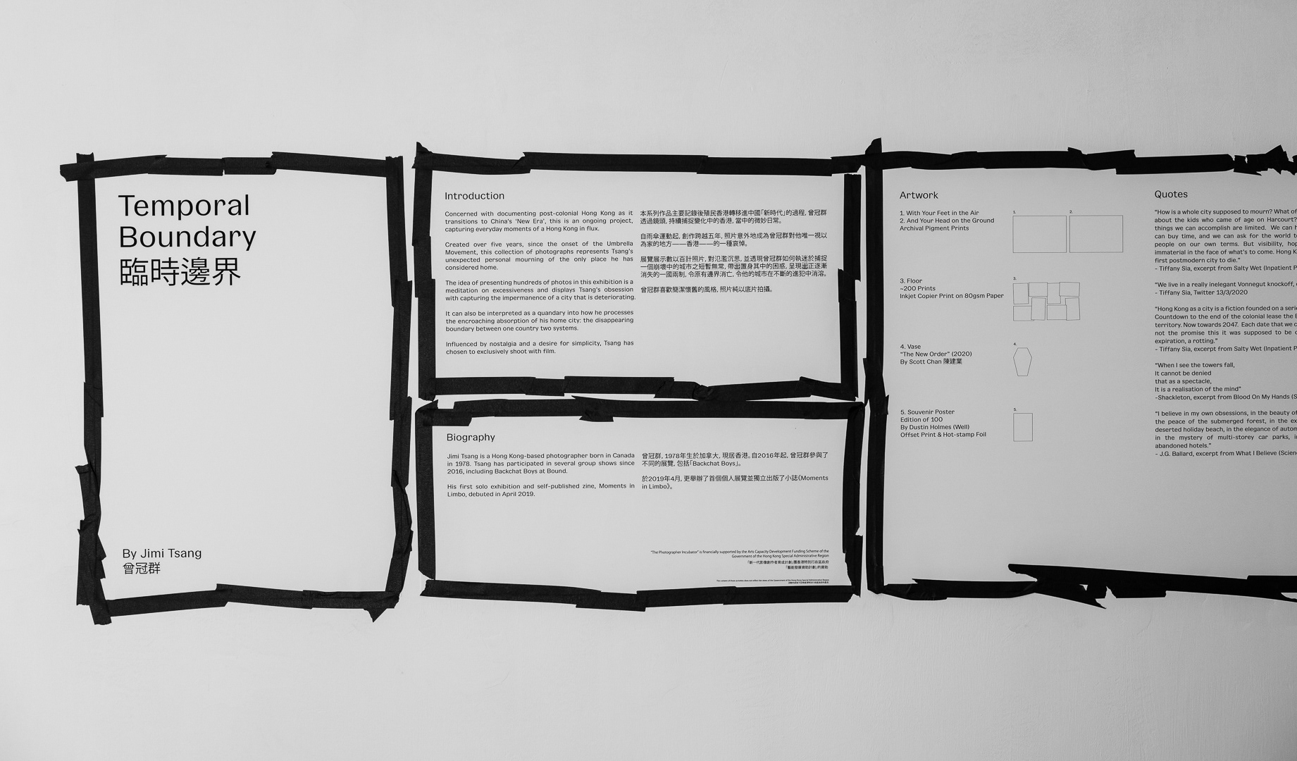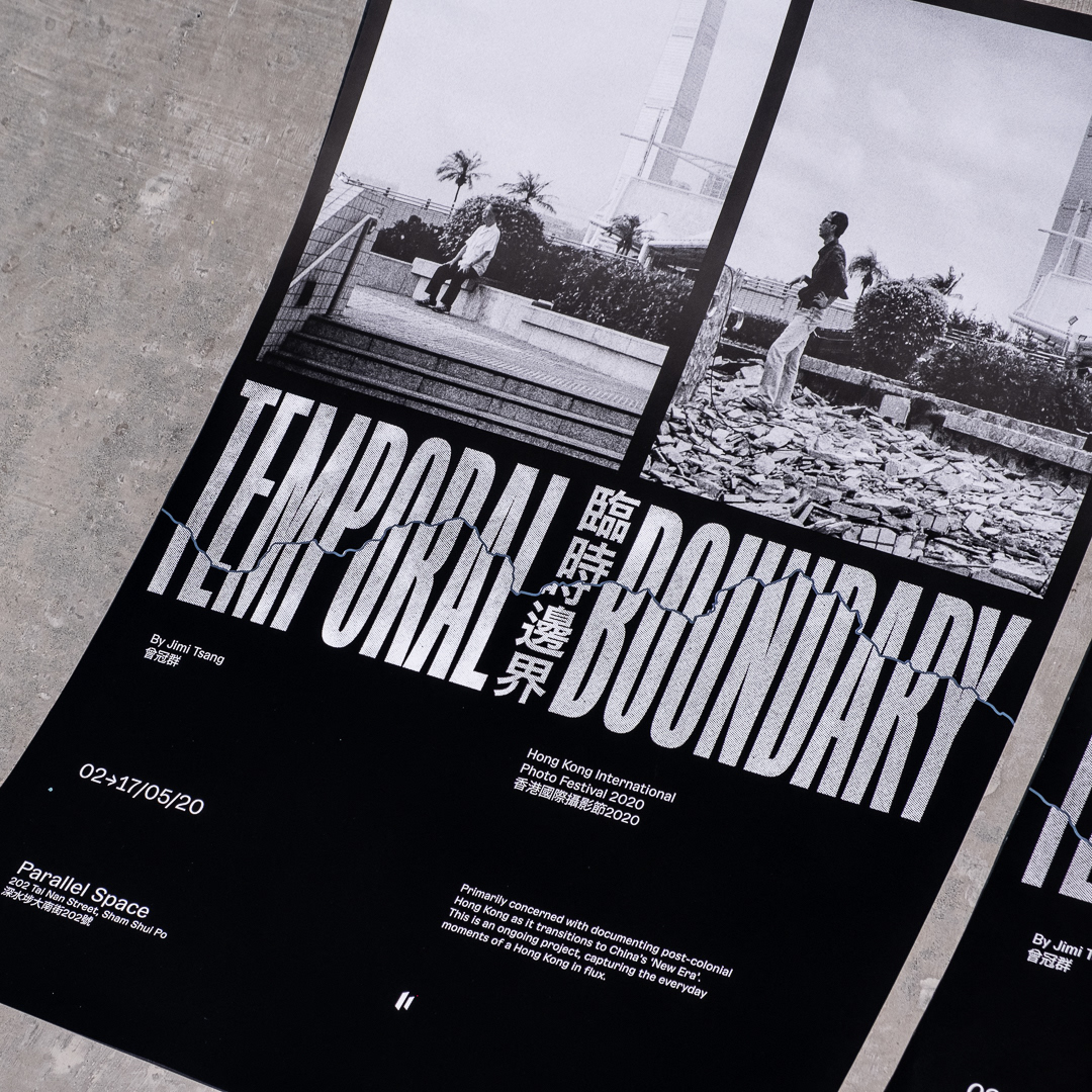 With this poster, I wanted to allow Jimi's photos to shine first and foremost while highlighting the concept behind the photography. Jimi's body of work for "Temporal Boundary" was intended to discuss the ever dissolving divide between Hong Kong and China, the unrest, and the sense of fear it has left many Hong Kongers in.